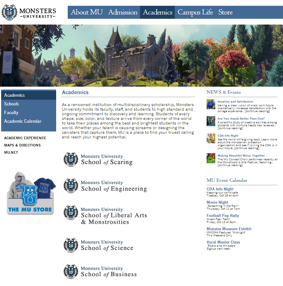 Bem nos moldes dos sites de universidades norte-americanas, a Pixar criou um site falso completíssimo para a divulgaçao da animaçao ‘Monsters University’ – tem calendário de eventos, mapa do campus, cursos oferecidos e até mesmo uma lista das leituras sugeridas! O site ainda aproveita para vender produtos com a ‘marca’ Monsters University – sao canecas, camisetas, casacos e bonés. Simplesmente sensacional! A dica é do The Daily What.
