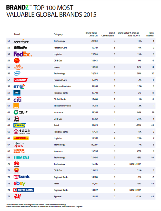 Entre as principais conclusoes do estudo BrandZ Top 100 2015, a Millward Brown destaca que a tecnologia é a categoria de crescimento mais rápido e o Facebook é a marca mais rápida em crescimento. Além disso, o valor das marcas de comércio eletrônico ultrapassa as marcas de varejo, o que é demonstrado com a entrada da Alibaba pela 1ª vez no ranking direto para a 13ª posiçao, ultrapassando Amazon e Walmart. O estudo também deixa claro que as marcas mais fortes entregam maior retorno para os acionistas e que as marcas europeias estagnaram, enquanto chinesas despontam e americanas reaparecem.