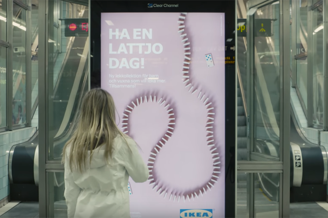 Uma das estaçoes do metrô de Estocolmo, na Suécia, recebeu esse painel interativo da IKEA que divulga uma nova linha de brinquedos da loja. A graça toda está em empurrar o 1º dominó da fila e depois assistir aos demais sendo derrubados – efeito ainda melhor quando acontece nos 5 painéis que ficam um ao lado do outro. :-) Saiu no DesignTAXI.