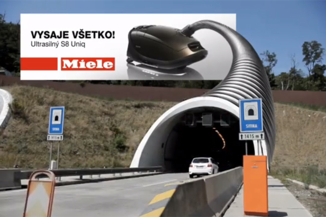 Para divulgar o poder de sucçao do aspirador Miele S8, a agência Mayer McCann Erickson, de Bratislava, resolveu criar um outdoor com um aplique que imita a mangueira do aparelho e acoplá-lo à entrada de um túnel. A impressao que dá é que todos os veículos que entram no túnel estao na verdade sendo sugados pelo aspirador :-) Acontece que o outdoor nem existe de verdade, ele só foi criado digitalmente e divulgado em um vídeo, o que gerou o maior buzz porque fez as pessoas perguntarem se ele existia mesmo ou nao – além, é claro, de comunicar o maior benefício do produto. Saiu no DirectDaily.