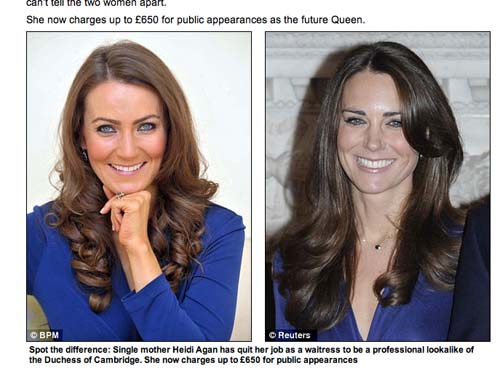 Mais uma dos tabloides britânicos. Descobriram Heidi Agan, 32, que deixou o emprego de garçonete para ganhar até 650 libras – mais de R$ 2 mil – por dia para aparecer publicamente como sósia da mulher do príncipe William. Acha mesmo parecidas? Do Daily Mail. Heidi, que é mae de 2 crianças, resolveu deixar o emprego de garçonete, levada pelos comentarios dos clientes “admirados com a semelhança” :)